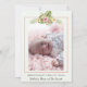 Notre jolie carte photo faire-part de naissance présente votre belle petite fille avec son nom sur le devant avec des fleurs tropicales roses et un mignon manchot. Customisez le dos avec une photo de nouveau-né et un texte de script pour présenter les informations importantes sur la naissance de votre bébé, ainsi que les noms des parents. La photo est encadrée par un cadre pastel doux surmonté de fleurs tropicales roses, vertes et jaunes aquarelles.