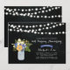Un faire-part d'anniversaire de mariage rustique élégant avec un pot mason et un bouquet de fleurs sur fond de tableau noir.