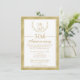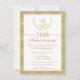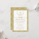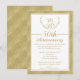 Cette invitation pour le 50e anniversaire de mariage comporte une fausse couronne de laurier et une bordure dorée. Les initiales du couple apparaissent dans la couronne de laurier en haut de l'invitation. La zone de texte est blanche avec une bordure et un séparateur de couleur dorée. La bordure sur le devant de l'invitation et le verso de l'invitation comporte un fond doré avec un motif en forme de diamant. Cette invitation avec couronne de laurier et dorure est prête à être personnalisée.