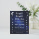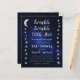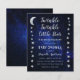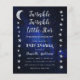 Une invitation de baby shower céleste avec des étoiles et une lune sur les bordures gauche et droite et un ciel étoilé en fond. Le texte est gris clair et blanc. Le titre "Twinkle Twinkle Little Star" et le nom sont écrits dans un script doré écrit à la main, avec de petites étoiles sur les i dans les mots "Twinkle". Au dos, il n'y a que le fond de ciel étoilé.