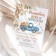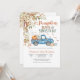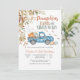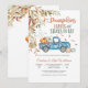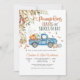 Célébrez la joie d'une nouvelle arrivée avec ce charmant faire-part de baby shower d'automne mettant en vedette un vieux camion bleu rempli de citrouilles, de foin et de ballons de fête. Entouré de feuilles tombantes et de feuillage saisonnier, ce design capture la chaleur de la saison des récoltes et crée une atmosphère chaleureuse et accueillante. Parfait pour les baby showers sur le thème de l'automne, il mélange le charme rustique à l'élégance saisonnière pour ravir vos invités.