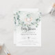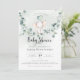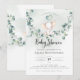 Un petit éléphant mignon sur une balançoire de branche d'eucalyptus. Cette invitation à une baby shower présente des aquarelles dessinées à la main et des polices modernes.