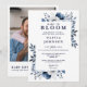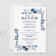 Cette élégante invitation de baby shower 'baby in bloom' à fleurs bleues peut être personnalisée avec vos informations en typographie moderne, une photo spéciale au verso et votre code QR de liste de naissance. Conçue par Thisisnotme©