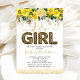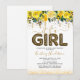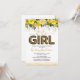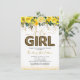 Cartons d'invitation de baby shower mignons avec un fond blanc simple, jolis reflets, fleurs aquarelles jaunes élégantes, la phrase "c'est une fille" en écriture et police de ballon imprimé léopard, et un modèle de célébration de bébé facile à personnaliser.
