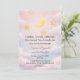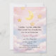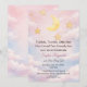 Célébrez un doux petit rêve sous la lune et les étoiles. Cette invitation de baby shower à l'aquarelle douce présente un croissant de lune lumineux, des accents d'étoiles dorées et des nuages teintés de rose pour un thème céleste romantique.