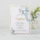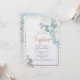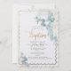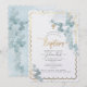 Faire-part de baptême PixDezines, avec aquarelle verte luxuriante et eucalyptus gunnii ; une croix en faux or, poussière d'or et cadre accentué d'un script de calligraphie de luxe. Tous les éléments sont modifiables et amovibles.