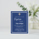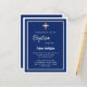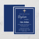 Une invitation moderne et élégante. Un fond bleu marine orné de cadres blancs et d'une croix dorée. Personnalisez et ajoutez un nom et des détails. Texte blanc.