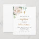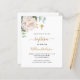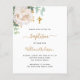 Un fond blanc décoré de verdure d'eucalyptus, d'une pivoine blanche et de feuilles dorées. Personnalisez avec le nom de l'enfant et les détails de la cérémonie. Lettres de couleur noire et dorée.