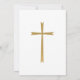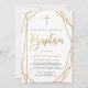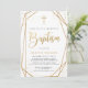 Faire-part de baptême garçon moderne et élégant avec écriture manuscrite ''baptême'' en lettrage doré, cadre doré, croix dorée sur fond blanc. Personnalisez avec des détails en lettrage majuscule tendance.