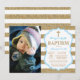 Faire-part de baptême pailleté bleu et or avec photo personnalisée. Baptême garçon. Première communion. Baptême. Dédicace d'enfant. Rayures or et blanc. Pour une personnalisation plus poussée, veuillez cliquer sur le bouton "Personnaliser" et utiliser notre outil de conception pour modifier ce modèle.