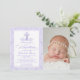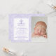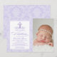 Faire-part de baptême damassé violet pour filles avec croix en perle violette et écriture élégante sur un joli fond en damassé lavande. Cette invitation de baptême élégante en damassé lavande et violet est facilement personnalisable pour votre événement en ajoutant simplement vos détails dans le style de police et la couleur, ainsi que la formulation de votre choix.