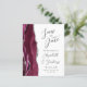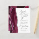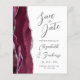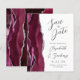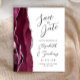 Le bord gauche de cette élégante carte de faire-part de mariage moderne présente une bordure d'agate couleur rouge bourgogne réalisée à l'aquarelle et agrémentée de faux strass argentés. Le texte personnalisable associe des écritures manuscrites grises charbon, des polices copperplate et italiques sur fond blanc. Le verso présente un motif assorti d'agate bourgogne et argent.