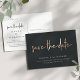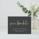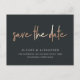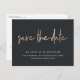 Une carte postale moderne de faire-part avec "save the date" en lettrage manuscrit à la feuille de cuivre sur un fond noir riche et doux. Personnalisez avec vos noms, date de mariage et lieu de mariage ci-dessous en lettrage blanc.