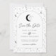 Une carte de faire-part de cérémonie à venir sur le thème de la lune et des étoiles célestes dans une palette de couleurs monochromes. Personnalisez la couleur du motif d'étoiles, du fond, du remplissage de l'arche et de l'élément de lune !