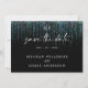 Faire-Part Moderne Abstrait de Date - Une guirlande de sarcelle vive et scintillante cascade sur la page, avec une calligraphie manuscrite "sauver la date" - les initiales du couple en haut - le reste du texte est simple et clair - tout sur fond noir. Papeterie de mariage élégante.
