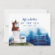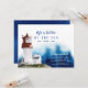 Belle aquarelle nouvelle maison faire-part avec un phare rouge et blanc côtier avec un lavage d'aquarelle bleu foncé.