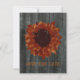 Faire part de mariage avec un fond de bois de grange à l'avant et à l'arrière. L'avant présente un tournesol qui semble avoir été peint sur du bois de grange. Personnalisez le texte à l'avant et à l'arrière. Recherchez des invitations assorties chez Jill's Paperie.
