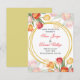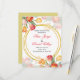 "Faire-part de mariage vibrant orné de tulipes colorées dans des nuances de rouge, orange, jaune et rose, encadrant magnifiquement le texte dans des cercles dorés élégants. La combinaison de l'art floral et de la typographie raffinée crée un design joyeux et romantique, parfait pour célébrer l'amour avec style."