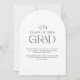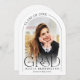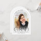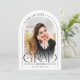 Cette faire-part de graduation minimaliste en noir et blanc présente une photo, un cadre en arc et une élégante typographie moderne.
