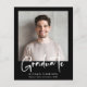 Faire-part moderne de graduation noire abordable avec votre photo et "Graduate" dans un élégant script blanc audacieux. Ajoutez le nom, l'école et l'année de classe de la jeune fille en simple typographie blanche.