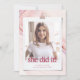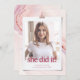 Elle l'a fait ! Chic | Faire-part de graduation en typographie moderne. Ce faire-part de graduation élégant présente un bel arrière - plan d'aquarelle abstraite rose sur une photo qui est conçu pour ressembler à un instantané vintage tout en étant élégant pour le diplômé d'aujourd'hui.