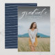 Un script classique simple "gradué" en blanc accentue une seule photo verticale de votre grade. Ce faire-part d'obtention de diplômes fonctionne pour les diplômés du collège ou du secondaire et est assez simple pour laisser briller votre photo. C'est un design intemporel et dispose également d'un dossier rayé avec une couleur personnalisable (par défaut, un bleu marine classique). Les mots sont en haut de la photo mais le design est aussi disponible avec les mots en bas.