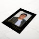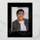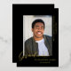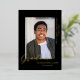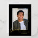 Un design simple, moderne et élégant pour un faire-part gradué avec arrière - plan noir. La carte a un espace pour une photo du diplômé et montre le mot GRADUATE au bas de la photo dans une véritable feuille d'or. En dessous de la photo est le nom du diplômé et sur le côté droit de l'image est le nom de l'école et la classe de 20XX. Le noir et l'or forment une combinaison élégante.