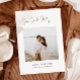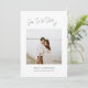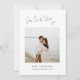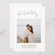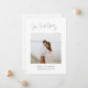 Carte de faire-part de grossesse élégante et minimaliste avec texte de script en haut qui dit "bientôt trois" avec un coeur. Vous pouvez ajouter une photo à l'avant et à l'arrière.
