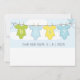 Une faire-part de grossesse mignonne et lunatique, illustration d'une ligne de vêtements avec bébé. Ajoutez vos noms et votre message. La date d'échéance est indiquée au verso du faire-part avec l'illustration de la ligne de tissu. Couper le ressort comme des couleurs pastel en bleu, jaune et vert. Non sexiste.