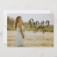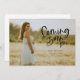 Carte de faire-part de grossesse élégante avec un texte de script de superposition qui dit "bientôt" avec un coeur. Vous pouvez ajouter 3 photos sur cette carte (avant et arrière).