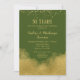 Une élégante invitation de fête d'anniversaire de mariage vert olive et or avec poussière de confettis dorés en haut et décoration clinquante dorée en bas.