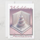 Faire-part de mariage avec un couple en 3D montré dansant sur leur gâteau - La carte est en rose avec le couple dans un carré avec les invités debout sous le gâteau. Vous pouvez modifier le verso de la carte pour obtenir des informations mariages pertinentes à la cérémonie ou au schéma de couleurs ou pour vous rendre au lieu. L'écriture est en rose pour aller avec le rose de la carte.