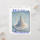 Faire-part de mariage avec un couple 3D montré dansant sur leur gâteau - La carte est en bleu avec un cercle au-dessus du couple. Vous pouvez modifier le verso de la carte pour obtenir des informations mariages pertinentes à la cérémonie ou au schéma de couleurs ou pour vous rendre au lieu. L'écriture est en bleu pour aller avec le bleu plus clair de la carte.