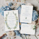 Cette élégante invitation de mariage présente une crête de monogramme personnalisée avec une bordure de fleurs d'hydrange bleues et blanches aquarellées et de verdure sauge, créant un look doux et invitant. L'illustration intemporelle offre un aspect romantique et soigné idéal pour les mariages formels ou côtiers. Ajoutez du texte personnalisé pour créer une invitation de mariage florale époustouflante que vos invités adoreront.