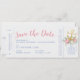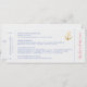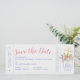Élégant thème d'ancre nautique, carte de sauvegarde qui ressemble à un billet d'embarquement avec un bouquet bohème floral entourant un logo de mariage à l'ancre surmonté d'un cœur romantique dans des tons de corail rose et de bleu poussiéreux clair. Les couleurs et les polices dans le modèle peuvent être modifiées, ou simplement entrer vos coordonnées de voyage et les informations de réception pour que les invités puissent commencer à planifier leur voyage vers votre mariage de destination au club de yacht plage.