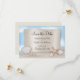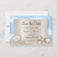 Élégantes annonces de sauvegarde de date pour un mariage sur le thème de la plage avec des coquillages, des dollars de sable, une étoile de mer et un message, sur un ciel bleu.