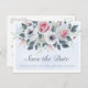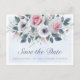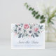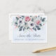 Création élégante de faire-part de mariage avec des roses à l'aquarelle et du feuillage sur un fond bleu pâle.