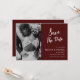 Cette élégante invitation à l'avance avec photo - comporte une écriture blanche manuscrite et un script et un emplacement pour votre photo sur fond bourgogne. Le verso de l'invitation est bourgogne. Vous pouvez ajouter votre propre photo ou laisser cette photo dans un style classique. Si vous avez besoin d'aide pour traiter votre photo, écrivez-moi un message.