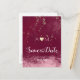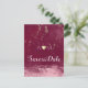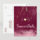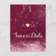 Un fond bordeaux rougeâtre avec des paillettes dorées factices qui tombent, un cœur monogrammé, les mots "sauver la date", vos noms et date spéciale... et au dos de cette carte de mariage élégante des lignes de texte personnalisées...