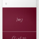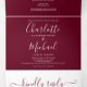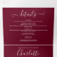 Faire-part de mariage triptyque tout-en-un couleur bourgogne avec une typographie élégante. Le faire-part comprend les détails d'information de vos invités de célébration et une carte RSVP détachable. Conçu par Thisisnotme©
