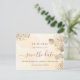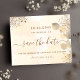 Un fond aquarelle doré orné de feuillage d'eucalyptus et de paillettes dorées. Personnalisez et ajoutez la date, le lieu et vos noms. Lettres de couleur dorée. Le texte : Save the Date est écrit avec un style de lettrage à la main tendance et grand. Dos : fond doré, conception de carte postale. Conseil : si vous ne voulez pas que cela ressemble à une carte postale, cliquez sur personnaliser, allez à l'arrière et supprimez le séparateur et le timbre-poste.