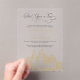 Créez une première impression magique avec cet élégant faire-part de mariage acrylique sur le thème du conte de fées. Parfait pour les mariages de château ou les fêtes romantiques, ce design personnalisable comprend des accents de château d'or et du texte personnalisé pour votre grand jour. Idéal pour les couples qui veulent une faire-part de mariage intemporelle et unique.