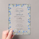 Un faire-part de mariage acrylique moderne avec une élégante peinture florale bleue. La disposition transparente et la typographie raffinée en font un lieu idéal pour les mariages de printemps ou de jardin. Voir collection correspondante dans la boutique La_Promesse.