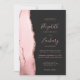 Le bord gauche de ce faire-part de mariage moderne élégant présente une bordure d'agate aquarelle rose blush rehaussée de paillettes de rose doré faux. Le texte personnalisable combine des polices rose rose écriture manuscrite, copperplate et italique sur un fond sombre et noir. Le verso présente un design d'agate assorti de couleur bordeaux et or rose.