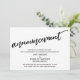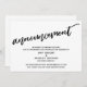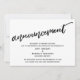 La distinction de cette suite est due à la police de caractères moderne et manuscrite utilisée pour les phrases d'accentuation. Dans le cas où vous auriez besoin de faire savoir à vos invités que votre mariage a été annulé, cette carte propose une option audacieuse et accrocheuse. Dans ce modèle, la police de caractères manuscrite a été utilisée pour créer un graphique simple représentant le mot "annonce". Utilisez les champs du modèle pour ajouter vos informations personnelles et faire de ce design moderne et unique le vôtre. Le fond blanc peut être changé en n'importe quelle couleur de votre choix. N'hésitez pas à nous contacter pour toute demande spéciale ou pour une aide à la personnalisation. // 100 //