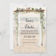 Faire-part de mariage avec guirlande de fleurs et arche en bois flotté de plage