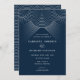 Faites la journée de mariage la plus extraordinaire de Great Gatsby avec ces invitations de mariage Art Déco, et reflètent votre style unique. Elles sont ornées de lampes à cordes inspirées des robes à lambeaux des années 1920. Ce design vintage a quelques lumières à cordes gris clair qui font le centre de l'attention et donnent le ton de votre événement. Le libellé est dans une police blanche moderne avec quelques éléments de police de script gris clair sur un élégant arrière - plan bleu marine riche. L'arrière dispose d'un motif art déco qui correspond à l'invitation partout. Vous pouvez customiser la police, la couleur et la taille de tous les éléments.
