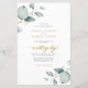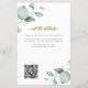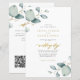 Élégante invitation de mariage bohème chic rustique botanique avec feuilles de eucalyptus vert sauge aquarelle, abordable et budget tous les détails sur votre site web avec calligraphie fausse dorée manuscrite et code QR à scanner pour RSVP en ligne.