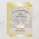 Faire-part de petit déjeuner de mariage de Noël avec bordures et envers de couleur or. Un arbre scintillant et une image de bougie servent de fond à une typographie moderne avec le texte incurvé "petit déjeuner de mariage" en haut. Ci-dessous, invitez des invités spéciaux à dîner avec les jeunes mariés et leur souhaiter "bon voyage" pour leur lune de miel.
