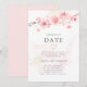Les fleurs de cerisier rose pâle les plus douces reposent sur une branche au sommet de cette annonce de changement de date de mariage moderne et minimaliste. Un lavis d'aquarelle rose à peine visible ajoute une dimension. Le dos de l'invitation est également rose pâle. Le résultat est une aquarelle botanique moderne.